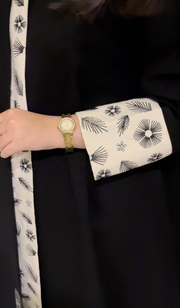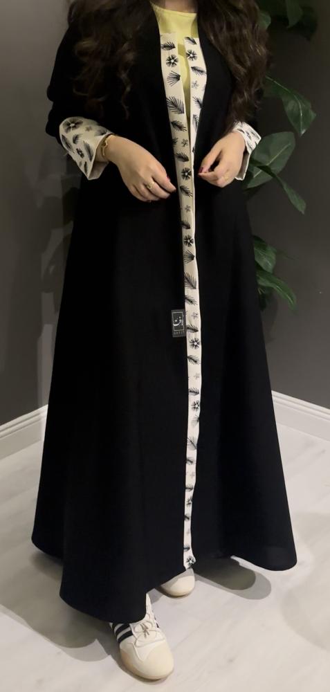 الاكمام والياقه قماش كتان باللون الاوف وايت مطرز بالاسود